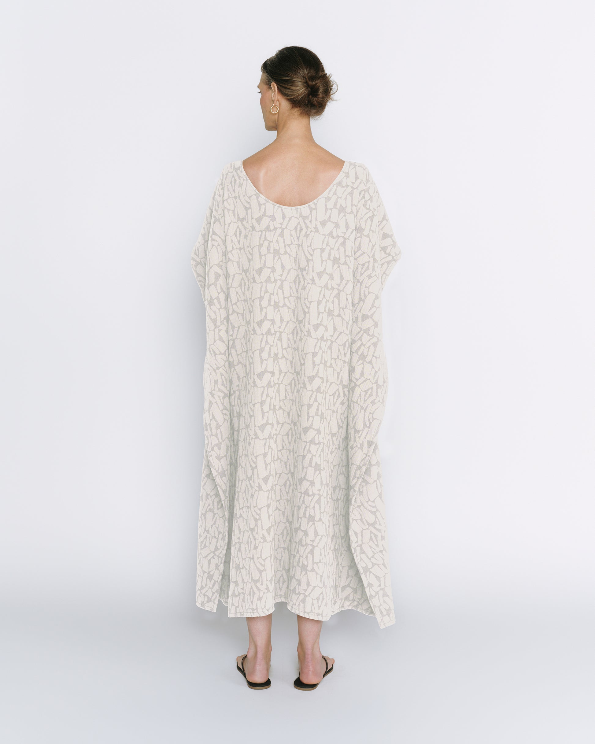Diana cape caftan floats with effortless grace, creating a sense of movement with every step. Gorgeous cotton jacquard.